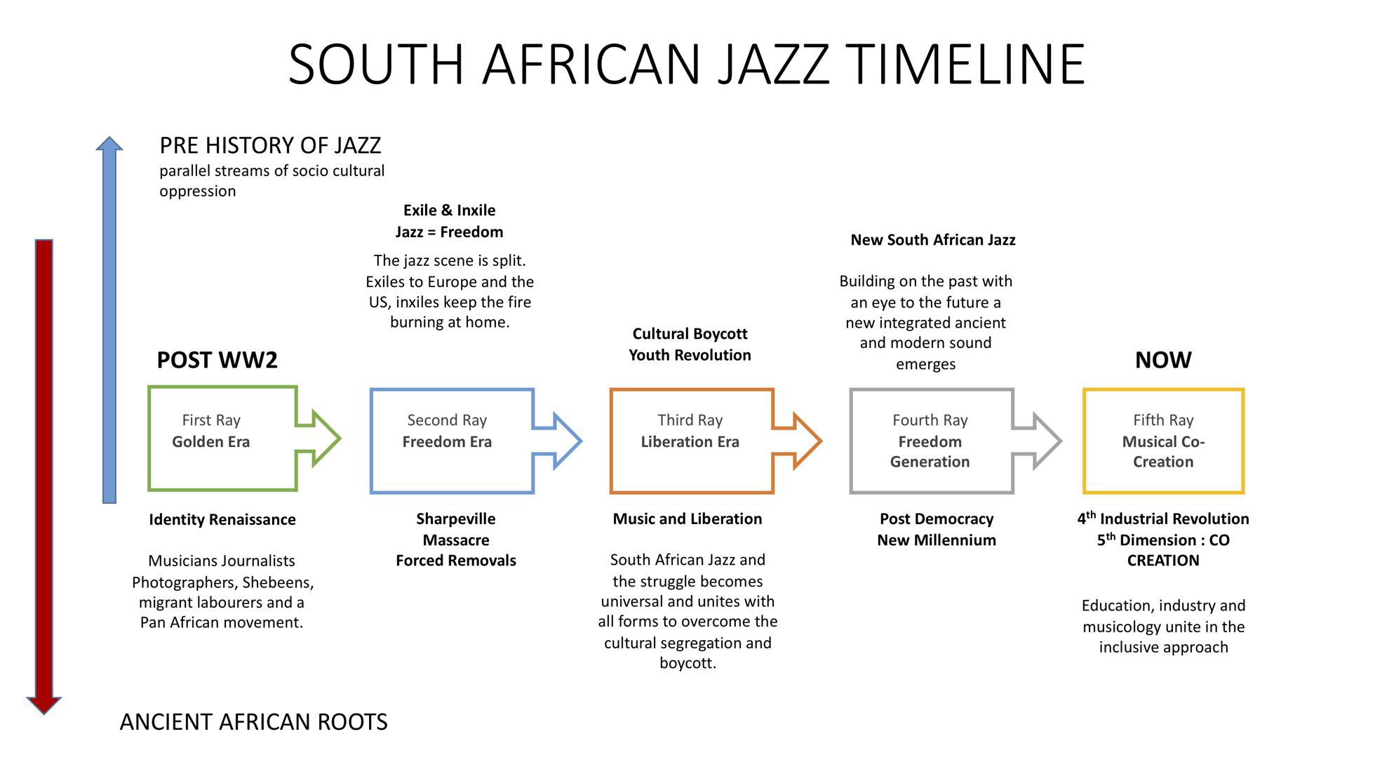 Story of South African Jazz is built on a solid history of self-expression where finding oneself is the present for every era. Jazz is a music that defies categorisation and the chains of slavery. It is a musical form beyond fear and is like the vivid array of colours that are natures' true abundance. By preserving and restoring the living legacies of the great South African musicians there is a holistic interpretation and development of knowledge in action.